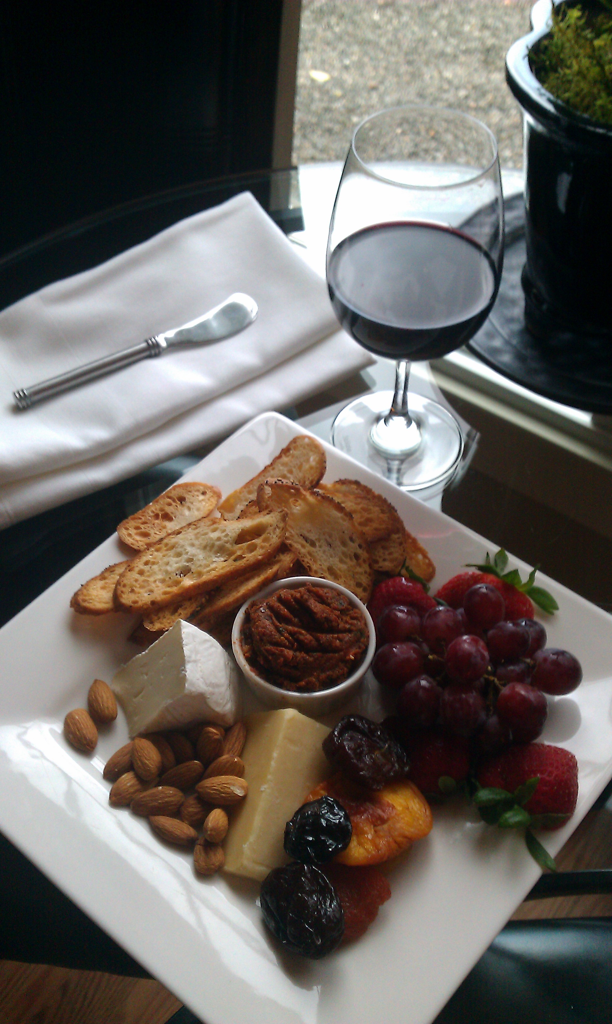 There was shopping and more wine tasting that day. We stopped at Regusci but there was a really large group (or two) of squealing young women there, so we headed down to Goose Cross Creek. We took a drive up a road Peter recommended for a great view of the valley. A mist occluded the view and wind tossed the trees up on the hilltop, but it was secluded and quiet. Not hungry at all, we nevertheless stopped for had the best french dip sandwiches we ever had at the Rutherford Grill (in Rutherford.) The place was packed at 2:00 p.m. and we snagged seats at the bar where I enjoyed a beer for a change. We stopped at Caymus, where vintner Chuck Wagner served us himself (although we didn’t figure that out until later,) and then drove into St. Helena for some shopping. I don’t have much to report on shopping–I’d rather shop flea markets and thrift stores than boutiques, but I had a great time looking around. By the time we were done, things were shutting down and Mr. W. and I were aching for some downtime. Which we got, with another fruit and cheese tray. The gravitational pull of the king-sized bed was irresistible so we spent the evening in, watching Moneyball and The Help (CdV also has a nice selection of DVDs.)