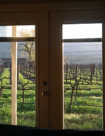but California modern and masculinely stylish inside. Our host Phillip, (who owns and runs the place with his partner, Peter) met us and offered us wine and water in the comfortable sitting room that shared the main floor with the dining room and kitchen. A spacious patio off the back led to a hot tub and pool but the temps made the fire inside the carriage house more inviting. He pointed out the small gray buds on their vines which promised leaves and fruit would be appearing in a week or two.
